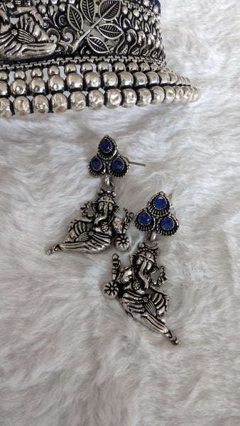 This oxidized choker features an intricately crafted Ganesh pendant, blending traditional symbolism with contemporary design. Its antique finish enhances the detailed artistry, making it a striking accessory that complements both ethnic and modern outfits. Lightweight and comfortable, this choker adds a meaningful touch to your jewelry collection.