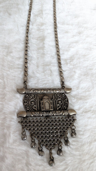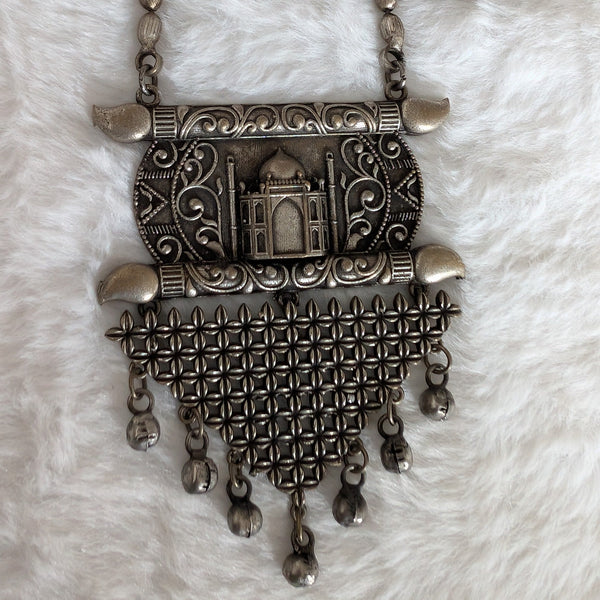Make a bold statement with this oxidized necklace featuring an intricate design that captures attention. Its detailed craftsmanship adds a touch of edgy elegance, perfect for those who dare to stand out and express their unique style. Elevate any outfit with this striking accessory that blends traditional artistry with a modern, fearless vibe.
